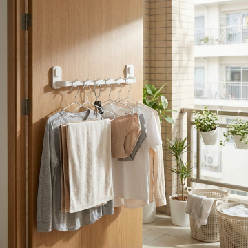 性冷淡风简约空间,柔和光影洒落木质地板,清透窗景映衬静谧冬日,衣物自然垂挂,营造舒适面料质感与实景般的宁静氛围。