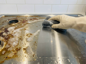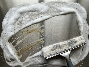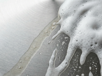 不锈钢板表面一道若隐若现的水渍与油污,正被清洁泡沫覆盖,暗示清洁过程,大面积,32K超高清,生成4张