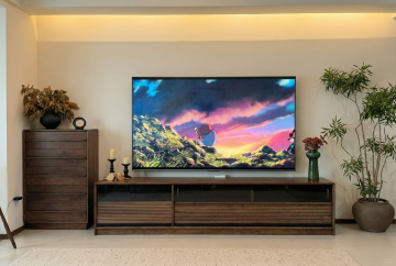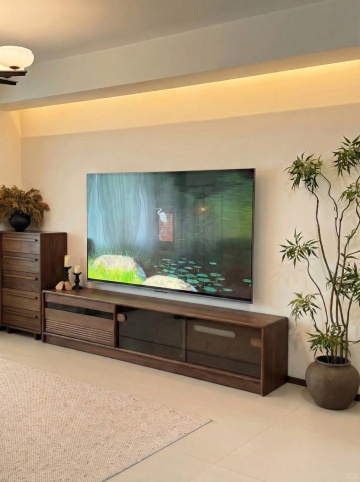 一个现代简约风格的客厅场景,阳光透过巨大的落地窗洒入,木地板泛着温暖的光泽,浅灰色的布艺单人沙发搭配黑色皮质脚凳,原木色的电视柜上放置着一台超薄智能电视,电视屏幕上显示着一个宁静的湖泊日落景色,湖面上有一艘小船,远处是连绵的山峦和橙红色的晚霞,天空中飘着几朵云彩,电视下方的应用图标清晰可见,电视柜上摆放着两个简约的黑色陶瓷花瓶,窗外可以看到城市的远景和山脉轮廓,整体氛围明亮、通透、舒适,具有高度的真实感和细腻的光影表现,光线从画面右侧窗户射入,在地面和家具上形成柔和的阴影和高光,色彩以原木色、灰色、白色为主调,搭配屏幕上日落的暖色调,构成和谐统一的现代家居美感。