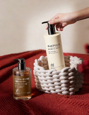 洗发水海报设计,两瓶深绿色透明液体洗发水瓶,搭配黑色按压泵头和白色标签,标签上有黑色文字与金色装饰细节,瓶身优雅放置于浅棕色木质树枝上。树枝下方是清澈湿润的水面,点缀着光滑石头,周围环绕着鲜活的绿色植物枝叶与根茎。整体采用清新自然的绿色调,柔和的侧光照明营造出宁静、有机、纯净的氛围,背景为渐变浅绿色。画面视觉层次清晰,以产品为绝对主体,光影效果细腻,水面呈现清晰的瓶身倒影,整体质感写实,设计简约自然,传达出天然植物萃取的产品特性。