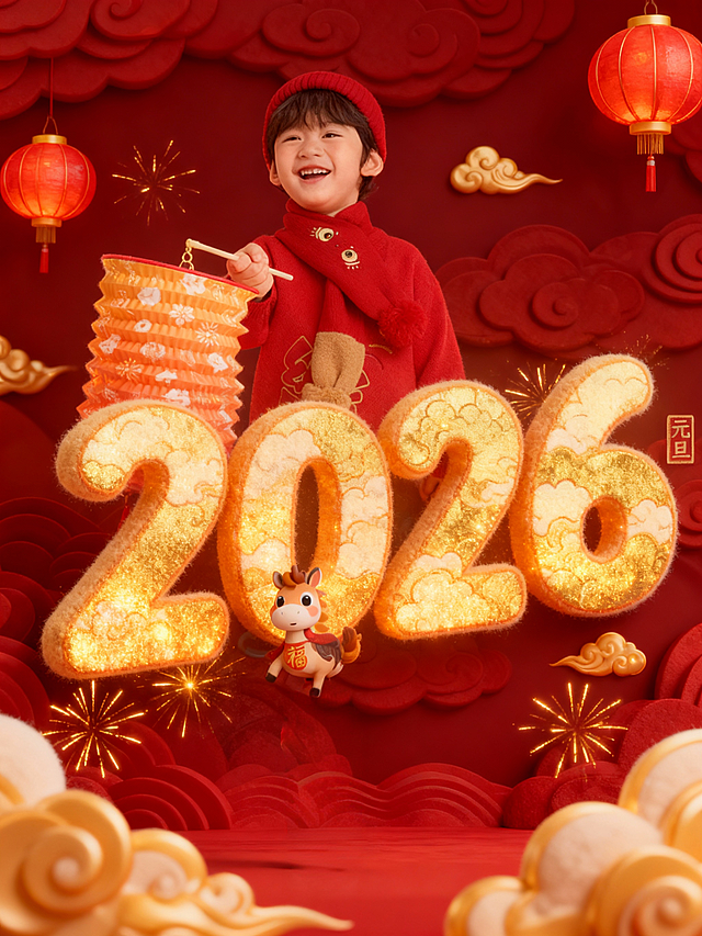 毛绒质感“新年快乐”字样搭配拟人牛玩偶,软3D风与国潮元素融合,喜庆卡通感十足,点缀节日装饰,传递2026年温馨祝福。详情