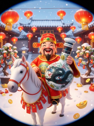 软3D风卡通财神骑马坐金元宝,鎏金质感搭配喜庆红橙色系,重拟物细节营造节日氛围,传递春节“马上有财”的吉祥寓意。