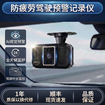 产品叫防疲劳预警记录仪A9设计一张商品主图,左边添加卖点:AI视觉预警、全天候监护、驾驶时长监控,并在卖点前添加相应图标。在图片下面添加文字框加入”一年质保 以换代修","顺丰 现货速发"“品质保证”等字样。背景为汽车前玻璃,视角为主驾驶位,参考热门商品主图,不改变商品形状颜色「图片1」