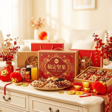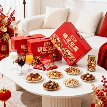 国潮风坚果礼盒,拟人化笑脸由坚果拼成,浮雕云纹点缀,喜庆红金配色,中式元素与现代创意融合,节日氛围浓厚。