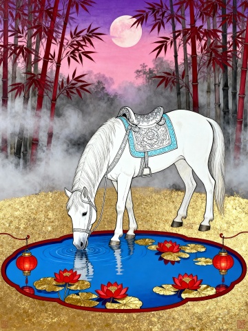 梦幻光影下的白骏马,融工笔风与国潮元素,鎏金刺绣点缀,极繁主义构图,尽显奢华唯美与古典优雅。