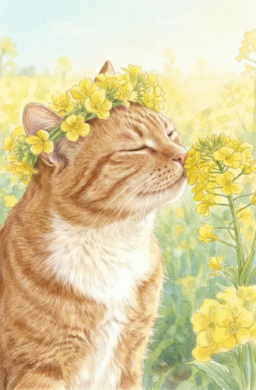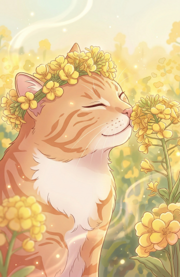 梦幻感水彩插画,拟人化猫咪戴花环轻嗅油菜花,柔和光晕与粒子飘散,营造春日清新唯美氛围。