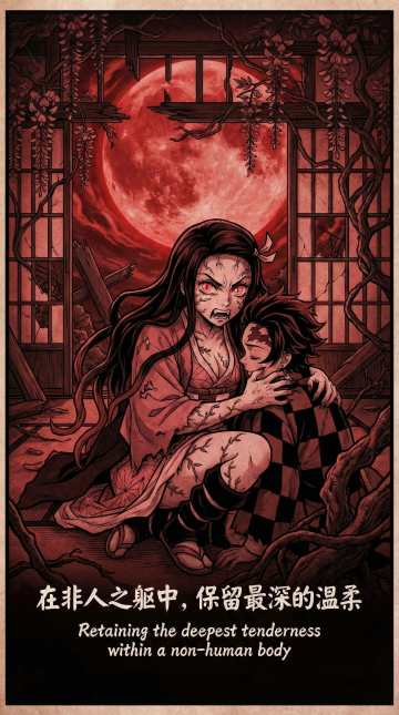 画面中有许多鬼灭之刃里面的角色面呈螺旋状排列,主人公炭治郎在旋转的海报中行走。固定聚焦在他身上,周围呈现朦胧模糊、涂抹、拖影的效果。