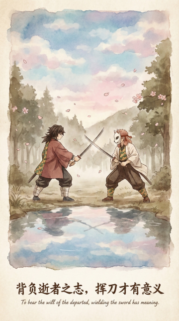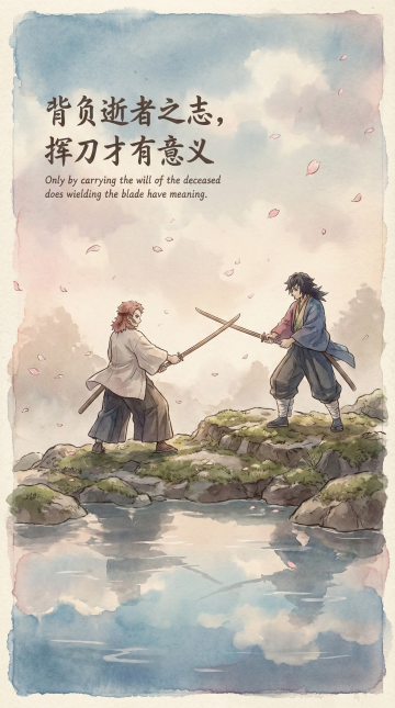 鬼灭之刃动画电影风格,灶门炭治郎挥出水之呼吸·拾之型“生生流转”,身体旋转带动湛蓝水流剑气,眼神坚定如磐石,背景为黑夜竹林,竹叶随剑气流旋飞扬。中文文字“温柔不是软弱,而是守护的决意”及英文翻译,动态水墨质感,青蓝主色调,竖版手机壁纸,8K分辨率,水流特效细腻。