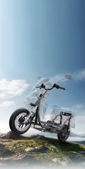 赛博朋克风夜景中,骑手疾驰于未来都市,金属质感机车与霓虹光影交织,头盔静置路面,虚实交错,科技感与酷炫感并存。