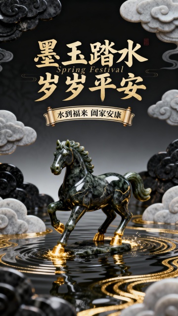 3D玉石材质,马年祝福海报。主体是白身金边玉石材质的骏马雕塑(细节精致,带纹理质感),中心对称构图,主体元素置于画面中心,玉雕祥云作为装饰;整体以浅米色、白色、金色为主色调,背景为浅米色渐变质感;书法艺术字主标题:“玉马呈祥 岁启新章”,带卷轴框的副标题:“玉马迎春到 阖家幸福来”,小字 “Spring Festival”穿插在主标题间