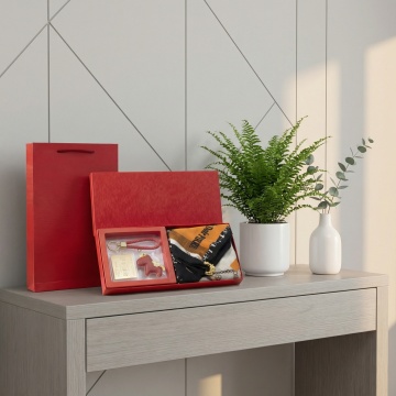 微距俯拍视角,浅灰色亚麻布背景上,右侧叠放着两个棱角分明的牛皮纸礼盒,表面有手工压印的编织纹理,顶部覆盖着象牙白蕾丝纸,精致的镂空花纹呈现出樱花枝蔓图案,自然质感的麻绳在盒身交叉缠绕后打成一个松散优雅的蝴蝶结,末端垂落的绳穗微微卷曲。左侧散落着五朵盛开的淡粉色樱花,其中两朵完全舒展露出淡黄色花蕊,三朵半开的花瓣边缘泛着柔美的珠光,旁边依偎着一个饱满的深粉色花苞和几片带着锯齿边缘的嫩绿色樱叶,一片花瓣轻盈地飘落在礼盒侧面。柔和的自然光从上方偏左45度角斜射而下,在礼盒表面形成渐变的阴影层次,樱花花瓣上凝结着两颗晶莹的露珠,背景角落散落着三两片樱花瓣,整体色调以浅灰、牛皮棕、淡粉和嫩绿为主,营造出简约自然、温馨优雅且略带春日浪漫的氛围,超高清晰度展现出纸张纹理、蕾丝镂空和花瓣脉络的细腻质感。