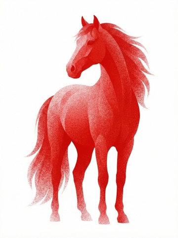 国潮风插画,描边浮雕手法呈现花卉纹样马身,红底白线勾勒唯美感与优雅文艺气息,寓意新春祥瑞。