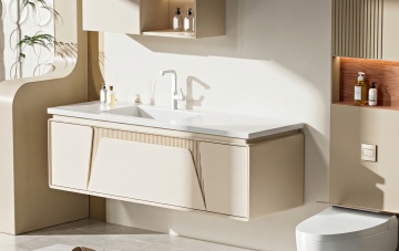 极简主义风格的卫生间室内设计,柔和的米白色与浅灰色调为主,整体明亮通透,自然光透过隐形光源均匀洒入,营造出干净、宁静、高级的氛围。浴室中央是悬挂式米白色洗手台,台面光滑整洁,台上放置简约设计的水龙头和几瓶透明瓶装洗漱用品,台下有隐藏式抽屉和开放式储物格,内置叠放整齐的毛巾与洗漱用品。洗手台上方是带LED灯带的长方形镜面柜,柜内隐约可见折叠整齐的毛巾,镜面清晰映照出浴室景象。右侧是白色壁挂式马桶,线条流畅。左侧为透明玻璃淋浴房,内部有简约的置物架和手持花洒。墙壁采用大块浅色瓷砖铺设,地面是光滑的白色大理石瓷砖,整体空间布局紧凑有序,功能分区明确。金属色毛巾架上挂着白色毛巾,与整体色调和谐统一。设计注重空间的简洁性与功能性,无多余装饰,强调材质本身的质感与光影的细腻变化,呈现出现代、简约、舒适的卫浴空间。