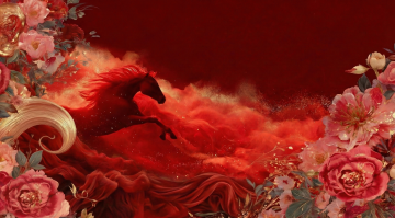 鎏金粒子勾勒奔马踏浪,国潮风韵融梦幻云海,喜庆红底映中式祥瑞,节日氛围跃然纸上。