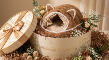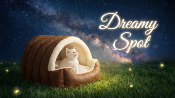 以图中的猫窝为元素,可爱安全的猫窝,温暖柔软,设计6张跟猫窝有关的图,物体主体特征不变,英语,比例 「16:9」「图片1」