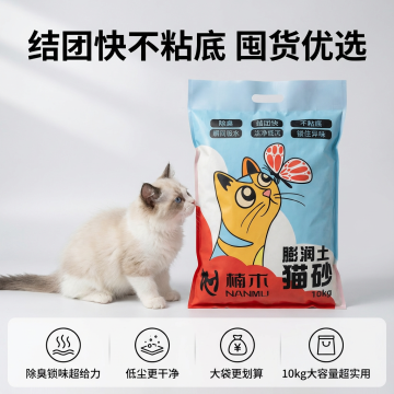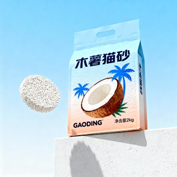 产品包装设计,主体是浅蓝色 + 浅橙色渐变的猫砂包装袋置于石膏站台上,低角度仰视视角,袋子上印有切开的椰子图案、蓝色棕榈树装饰元素,文字”木薯猫砂“和logo"GAODING"、"净含量 2kg";包装袋左侧悬浮着一团蓬松的白色猫砂颗粒;背景是纯净的淡蓝色渐变天空,整体风格清新明亮、商业产品质感,高清写实,8K 分辨率