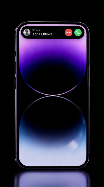 纯黑无杂质深色背景,底部带手机同色系柔和倒影;超写实高级商业产品展示风格,静谧科技感,光影柔和细腻;主色调为屏幕的紫蓝渐变(顶部浅紫、底部深紫蓝),手机边框呈深黑哑光质感;屏幕上方的框选区域内的黑色椭圆长条形状(位置不变,并扩大)里显示通话界面:纯黑无杂质深色背景,底部带手机同色系柔和倒影;超写实高级商业产品展示风格,静谧科技感,光影柔和细腻;主色调为屏幕的紫蓝渐变(顶部浅紫、底部深紫蓝),手机边框呈深黑哑光质感;屏幕上方的黑色椭圆长条形状(位置不变,并适当缩小)里显示通话界面:左侧是浅白色的听筒标志, “听筒右侧紧邻位置:显示 “0.000” 标识,字体颜色为浅白色,与 “9:41” 的字体样式、字号完全一致,右侧是浅白色的麦克风标志;通话界面位于黑色椭圆长条形状内,手机呈正竖居中分布,横向占画面约 70% 宽度,竖向占画面约 85% 高度;通话界面位于屏幕上方区域,手机呈正竖居中分布,手机屏幕其他画面保持不变,横向占画面约 70% 宽度,竖向占画面约 85% 高度。