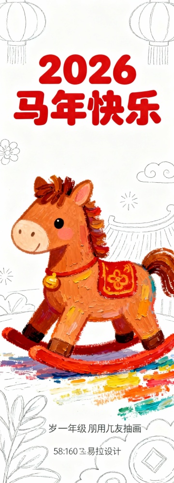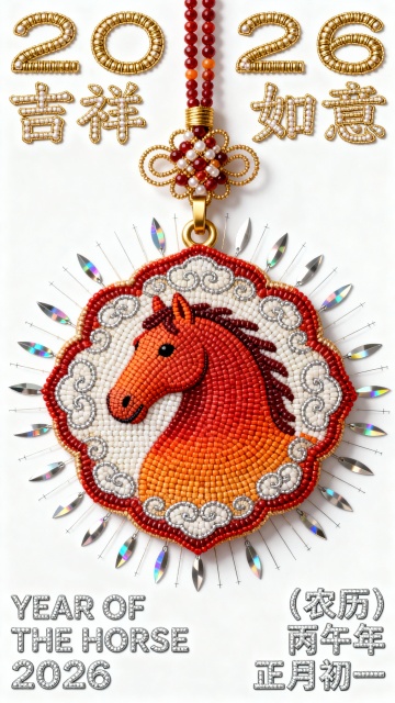 主体是红到橙渐变的圆柱形中式灯笼(表面饰有小马和宝相花纹图案),顶部配挂环与装饰珠,底部带金色饰边、中国结装饰及流苏,周围环绕柔和光晕。上下留白,左右留白,不要撑满整个画面。色调为纯白背景+ 红到橙渐变。画面上方有极细字体"2026""马年大吉",左下方小字“HAPPY CHINESE NEW YEAR OF HORSE” ,右下方小字“(农历)丙午年 正月初一”