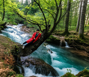 广角俯拍视角,晨曦微露时分,一片被晨雾轻轻笼罩的山谷湖泊全景。远处层叠的青灰色山脉峰顶覆盖着昨夜新降的皑皑白雪,山腰处云海如丝绸般缠绕流动。湖岸线蜿蜒曲折,一侧是橙红与金黄交织的茂密枫林,另一侧是深绿色的松树林,色彩对比鲜明而和谐。湖面如巨大的黑曜石镜面,精准倒映着渐变的天空——从东方鱼肚白过渡到淡粉、浅紫,再到远处的靛蓝。湖边长满沾着露珠的翠绿苔藓,几株红色浆果灌木点缀其间,几片枫叶轻轻漂浮在近岸水面。光线柔和而富有方向性,晨雾在阳光穿透下形成金色光柱,空气中悬浮着细小的水汽颗粒。构图遵循黄金分割,前景的岩石、中景的湖岸与远景的山脉形成完美的视觉引导线,景深从近岸的露珠到远山的积雪都保持清晰锐利,整体氛围既静谧神圣又充满苏醒的生命力。
