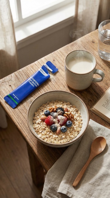 一张温馨生活风格的早餐场景特写照片,晨光从左侧窗户柔和洒落,在白色瓷杯和奶壶上形成细腻的高光与阴影,透明玻璃奶壶正将乳白色的牛奶以优美的弧线缓缓倒入下方带有精致花纹的白色瓷杯,杯口泛起细密的奶泡,牛奶流动的瞬间清晰可见。前景中,白色瓷杯置于配套的白色碟子上,碟子边缘有简约的描金装饰。背景更换为铺着浅灰色亚麻桌布的餐桌,上面摆放着新鲜出炉的金黄色牛角面包、几颗鲜红饱满的草莓和一小束淡雅的白色洋桔梗,整体色调以白色、米色、浅灰为主,点缀着食物的自然色彩,营造出宁静、舒适、充满生活气息的早晨氛围,画面构图采用经典的三分法,焦点集中在牛奶倒入杯中的动态瞬间,背景元素模糊处理以突出主体,光影柔和自然,呈现出温暖治愈的居家感觉。