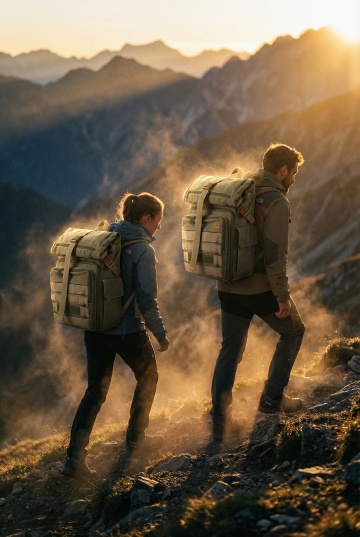 简约主义风格,柔和色调背包置于温暖阳光下,营造舒适感与宁静氛围。