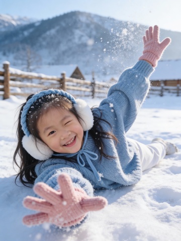 背景中改成积雪覆盖的地面、树木、一座小木屋以及远处的山脉,天空呈蓝色并飘着少量云朵,整体色调以蓝白为主,营造出清冷纯净的冬日氛围。人物服装的蓝色与白色雪地形成和谐的色彩搭配