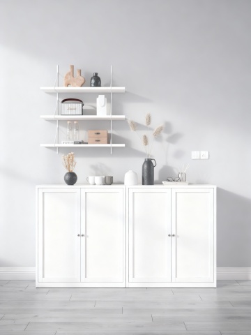 超写实风格白色滚筒洗衣机,银色金属质感圆形舱门,控制面板带旋钮和小型显示屏,顶部放置透明玻璃杯、米色按压瓶和棕色小瓶,左侧为装满白色毛巾的编织篮,旁边有绿色植物。柔和自然光从右侧照射,高光与阴影对比清晰,物体表面光滑反光。背景改为简洁的浅灰色水泥墙面,搭配木质搁板和白色收纳柜,地面为光滑白色瓷砖,整体营造现代简约、干净整洁的家居氛围。