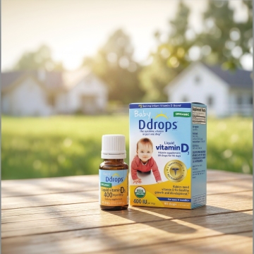 生成一张摄影图,主角是一个小男孩,正在服用维生素D,比例4:3