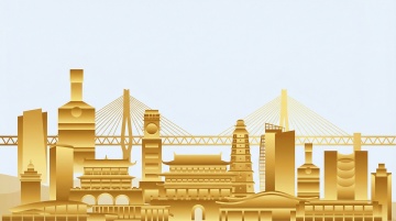 3. 俯视角度,6个圆形框架布局,纯靛蓝色背景,外滩建筑群被简化为高低错落的几何轮廓,建筑顶部点缀金色线条,水面倒影呈现对称的几何图形,展现秩序美感。