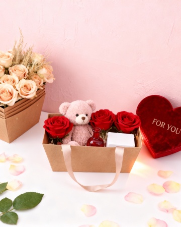 风格:极致浪漫的氛围感场景风,视觉焦点集中于爱心镂空与玫瑰堆叠,主色调为高饱和深红色系; 构图:竖幅构图,画面核心为心形镂空结构,四周以红玫瑰密集堆叠,背景预留柔和留白增强呼吸感; 主体元素(细节刻画): 心形镂空墙面: 形态:墙面呈超细腻的深红色肌理质感(无斑驳纹理,表面平滑且带有微弱光泽),中央为清晰的心形镂空结构(边缘线条流畅柔和,带有细微高光勾勒轮廓),镂空内部透出同质感的深暗红丝绒背景层; 质感:墙面肌理细腻均匀,心形镂空边缘与墙面的过渡自然,无粗糙纹理,整体质感精致统一; 红玫瑰: 品质:高鲜艳度的真实花瓣材质红玫瑰(花瓣纹理清晰自然、褶皱立体通透,带有真实花瓣的轻薄柔润质感,颜色为饱和亮红色),多朵玫瑰呈密集堆叠状分布于心形镂空的四周(部分玫瑰半遮挡镂空边缘),搭配少量鲜绿色叶片点缀; 排布:玫瑰大小错落,近景玫瑰清晰锐利(花瓣脉络可见)、远景玫瑰轻微虚化,强化空间层次; 设计要点: 材质:墙面肌理超细腻无斑驳,玫瑰为真实花瓣质感(轻薄通透、脉络清晰),整体材质真实高级; 光影:整体光影过渡柔和,暖调光源聚焦玫瑰与心形镂空区域,突出真实花瓣的明暗层次与通透感,背景留白处光影渐弱; 配色:以高饱和亮红为主调,颜色由近景玫瑰的鲜艳红向背景的深暗红自然渐变,和谐统一; 辨识度:心形镂空与真实花瓣玫瑰堆叠形成强视觉记忆点,留白布局增强画面呼吸感,强化浪漫氛围。整体氛围暖色调。