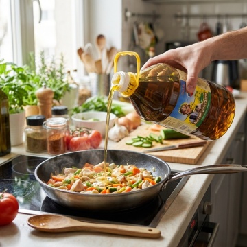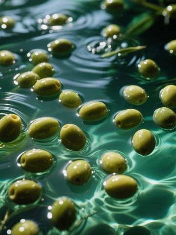 微距俯拍,一滴琥珀色橄榄油正以缓慢优雅的姿态从竹制滴管末端坠落,完美的泪滴状油珠在接触下方平静的橄榄油表面时形成精准的涟漪,油面折射出午后阳光穿透玻璃窗的菱形光斑,背景是质感粗糙的浅木色砧板,几缕迷迭香碎叶散落在油池边缘,橄榄油特有的黄绿色调在侧逆光下呈现出丝绸般的流动质感,高光处如液态黄金般耀眼,阴影区域泛着青绿色的微妙反光,捕捉油脂分子在表面张力作用下形成的完美几何形态。