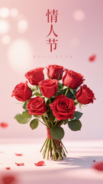 3D浮雕风玫瑰心形花束,鎏金丝带缠绕,搭配喜庆灯笼与花瓣飘落,浪漫唯美中透出新春喜庆,尽显优雅与节日氛围。