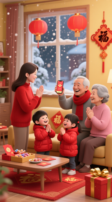 温馨明亮的中式家庭客厅,温馨明亮的中式家庭客厅,以暖米色和原木色为基调,点缀中国红与吉祥金,柔和的自然光从左侧窗帘透入,洒下琥珀色光晕。沙发上,白发爷爷穿着浅灰色毛衣和米色裤子,面带微笑,身旁的奶奶穿着粉色开衫,抱着穿着白色上衣和黑色裤子的小女孩,小女孩正开心地与奶奶拍手。年轻男子穿着米白色高领毛衣,站在爷爷身后,手搭在爷爷肩上,笑容满面。右侧厨房门口,穿着白色高领毛衣和黑白格子围裙的女子端着一盘食物,微笑着看向家人。墙上贴着红色的"福"字,书架上摆放着金色奖杯、相框和书籍,餐桌上有水果和点心,整体氛围温馨和睦,充满家庭的温暖与幸福。采用对称式布局,以中央沙发区域为视觉焦点,左侧窗帘与右侧厨房门形成平衡结构。沙发上,白发爷爷穿着浅灰色毛衣和米色裤子,面带微笑,身旁的奶奶穿着粉色开衫,抱着穿着白色上衣和黑色裤子的小女孩,小女孩正开心地与奶奶拍手,构成前景核心人物群。年轻男子穿着米白色高领毛衣,站在爷爷身后,手搭在爷爷肩上,笑容满面,形成后景层次。右侧厨房门口,穿着白色高领毛衣和黑白格子围裙的女子端着一盘食物,微笑着看向家人,作为右侧视觉锚点。墙上中央位置贴着红色的"福"字,书架和餐桌作为左右对称的次要视觉元素,摆放着相框、书籍、水果和点心,整体布局疏密有致,空间感强,营造出温馨和睦的家庭氛围
