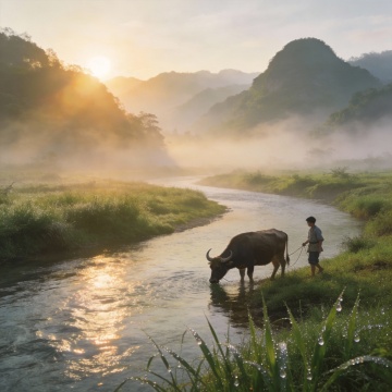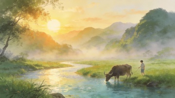 全景:苍茫的田野,夕阳西下,炊烟袅袅,牛郎牵着老牛缓步走过田埂,要求:画面偏暖黄,营造孤寂却安稳的氛围「图片1」「图片2」