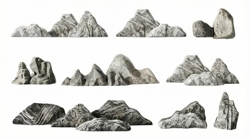 一组由6个不同造型的天然岩石组成的系列素材集合,每个岩石均保持高度写实的3D质感,表面具有自然的粗糙纹理、裂缝和不规则边缘细节,采用纯黑色背景,整体呈现出冷色调的光影效果,光源来自左上方,在岩石右侧形成柔和的阴影过渡,所有岩石元素规整地呈两行三列排布,彼此间距均匀,构图简洁大气,每个岩石造型各具特色,有的棱角分明,有的相对圆润,有的表面纹理更复杂,共同构成一套风格统一且富有变化的自然岩石素材。