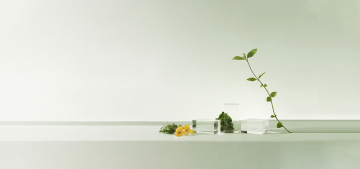 极简主义风格台面设计,纯净白色台面搭配白色背景墙,右上角放置透明玻璃花瓶,瓶中插有黄绿色系植物,柔和自然光从左上角斜射,在墙面和台面上形成清晰的几何条状光影,整体色调以白色、浅灰色和黄绿色为主,配色简洁明快,画面构图平衡,光线柔和,营造出宁静、干净、通透的氛围,台面下方可见浅灰色柜体的局部。