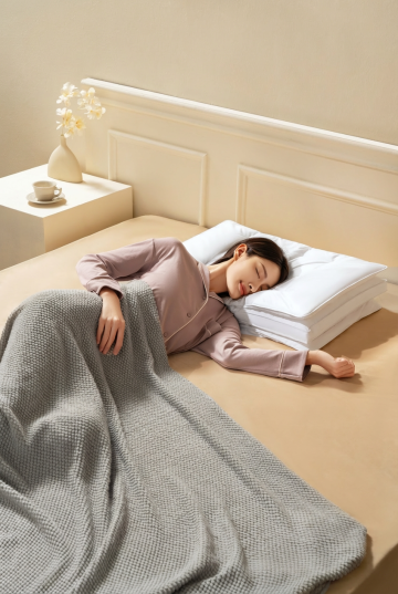 一张温馨的卧室场景,中央是一张铺着棕色床垫的床,床垫表面柔软舒适,带有自然的纹理。阳光透过窗户洒在床垫上,形成温暖的光斑。床头柜上摆放着一盏柔和的台灯和一盆绿色植物,整体色调温暖柔和,营造出舒适、放松的居家氛围。