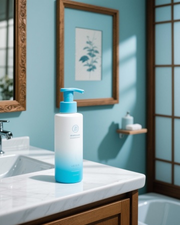 清透玻璃瓶置于水波之上,光影流动,液态感与轻拟物设计交织,传递夏日清爽与柔和舒适。