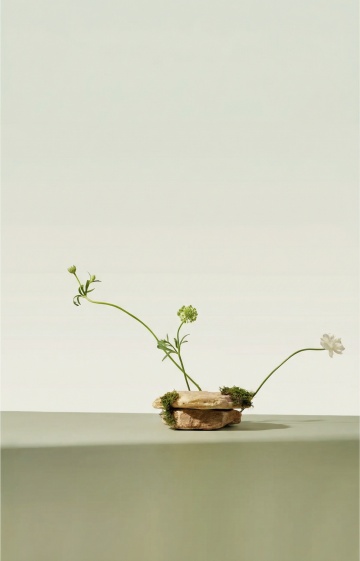 极简主义风格,白色纯净背景,中央放置一块圆形灰色石质平台,表面粗糙有自然纹理,左侧平放一朵白色雏菊花,花瓣呈放射状,黄色花心,右侧竖立一株细长绿色植物,带有几片椭圆形叶片,整体构图简洁对称,光影柔和,物体边缘清晰,色调统一,营造出宁静、自然、简约的氛围,无任何文字和装饰元素。