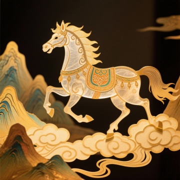 鎏金剪纸风骏马踏云,古典中式意境交融梦幻与优雅,奢华质感中透出唯美的东方神韵。