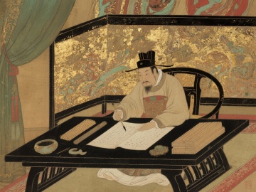 宦官手持圣旨宣读,杜秋娘跪地接旨,神情悲戚