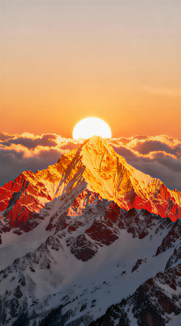 超写实风格雪山全景,画面整体色彩变换为温暖的橙红色调,雄伟的雪山群峰被夕阳染成金红色,山顶覆盖着橙红色的积雪,山体岩石呈现暖棕色纹理,广阔的雪原在暖光下泛着柔和的橙黄色光芒,天空是渐变的橙红到粉紫色,点缀着被霞光映照的白色云朵,光影柔和,高光区域呈现明亮的金黄色,阴影部分带有温暖的橙红色调,整体营造出壮丽而温暖的雪山日落氛围,细节丰富,质感细腻,构图采用三分法,雪山群峰占据画面主体,雪原作为前景延伸至远方,空间感强烈。