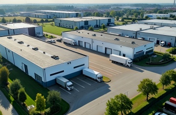 超写实主义摄影风格,高清晰度,明亮自然光从顶部天窗和两侧高处窗户均匀洒落,光线柔和无强烈阴影,整体色调以工业灰、金属银、纸箱棕黄为主,辅以局部亮色点缀。纵深构图,中央是洁净光滑的浅灰色环氧地坪通道,两侧高耸的金属仓储货架整齐排列至画面尽头,货架上堆满不同尺寸的棕色纸箱,部分纸箱贴有蓝色或黄色胶带标签。不同样式的现代化仓库内部场景,保留金属货架结构和整齐堆叠的纸箱核心元素,可替换为具有不同布局(如U型货架、多层阁楼式货架)、不同仓储设备(如叉车、传送带)或不同货物类型(如塑料托盘、金属容器)的仓库环境,通道尽头可设置不同的墙面设计或仓库门样式,保持空间的通透感和工业仓储的秩序感,画面干净整洁,细节丰富,具有强烈的空间纵深感和真实的材质质感。