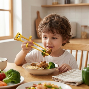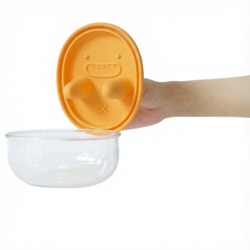 我的产品儿童硅胶餐勺,请帮我设计一个场景,一个白人宝宝坐在餐椅中,餐椅板上放着一碗辅食,宝宝手里握着产品。背景为欧美室内,保持产品细节不变