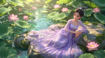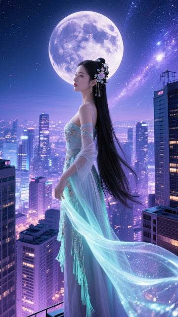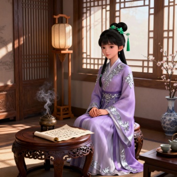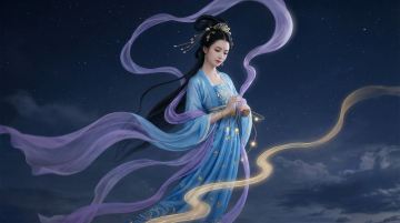 身穿着内层为素雪纱齐胸襦裙,绣有暗纹星轨;中层为淡蓝渐变云锦广袖长衫,袖口有流动的光纹;外层为透明鲛绡披帛,随动作如银河飘动;足部为银丝绣鹊履,踏过处留下短暂星尘;配饰有着腰间悬玉梭(可化光为线),腕戴牛郎所赠的草编手环。核心特质:外柔内韧的创造者