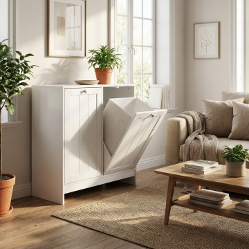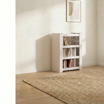 现代简约风边柜,融合性冷淡与轻拟物设计,弧形玻璃门与柔和配色营造温馨舒适感,搭配抽象画作与自然元素,展现文艺氛围。