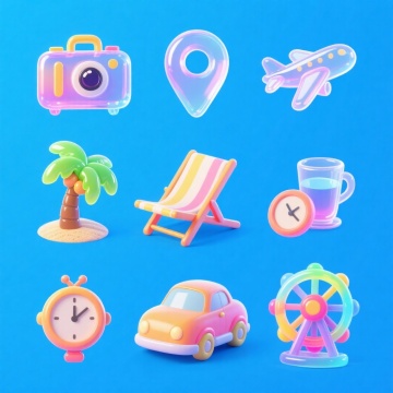 梦幻软3D风设计,卡通感十足的旅行元素,液态质感带来夏日度假氛围。