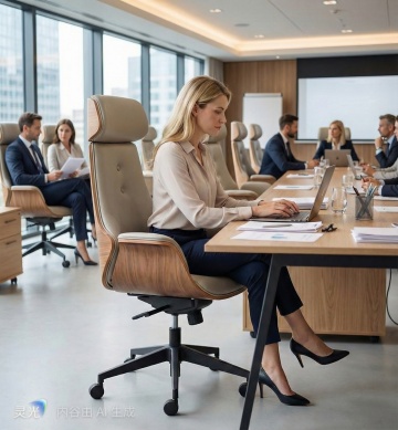 明亮的现代办公室环境,柔和的自然光透过大面积玻璃窗洒入室内,温暖的木质办公桌,桌上放着笔记本电脑、打开的笔记本、蓝色马克杯和一支铅笔,穿着米色开衫与白色衬衫的女性正在专注地使用笔记本电脑,背景有白色书写板、木质书架和简约办公家具,整体风格简约、专业、温馨,具有清晰的空间层次感和舒适的工作氛围,高清晰度,写实摄影风格,柔和光线,自然色彩。