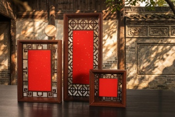 一张中式古典风格的实木长桌特写,桌面呈现温润的浅棕色木纹,边缘为深棕色雕花实木边框,桌腿带有精致的传统中式镂空雕刻纹样。背景是一幅模糊的古画,整体画面采用暖色调光线,光线从斜上方照射在桌面上,形成柔和的光影过渡,营造出宁静、典雅、富有文化底蕴的氛围。画面聚焦于桌子的质感和细节,木纹清晰可见,雕花精致细腻,整体构图采用近景特写,突出实木家具的自然纹理与工艺美感,具有浓厚的东方传统韵味和古朴雅致的设计感。