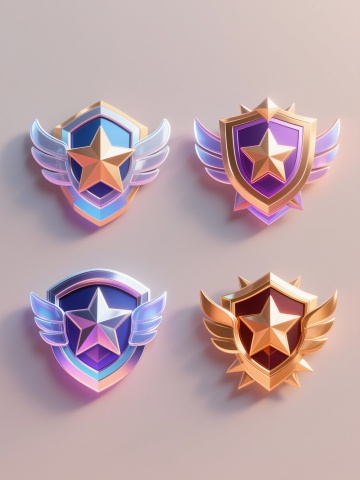 三个垂直排列的六边形徽章,从上到下依次标有文字金、银、铜,每个徽章两侧各有一对翅膀,徽章边框上有五角星装饰,整体为卡通风格,色彩鲜艳,上为金色、中为银色、下为铜色,保持原有的布局和色彩,将材质改为磨砂金属质感,表面带有细腻的磨砂纹理,反光柔和不刺眼,立体感强,翅膀部分呈现出轻盈的磨砂金属薄片效果,数字为磨砂金属本色且略微突出于徽章表面,背景为纯白色。